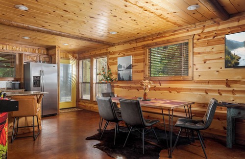 Escape to the perfect getaway with this elegant log cabin. Located near local restaurants and attractions, this friendly cabin is ideal for hosting friends and family seeking a relaxing adventure. You'll love both the indoor and outdoor games, hot tub, fire pits, and modern kitchen, creating a welcoming retreat for your group.