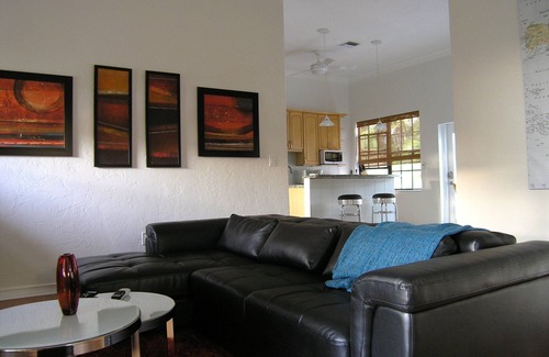 Outside, at the entrance to the unit is a brick patio with a table and chairs. A tropical garden and walkway lead you toward the orchid and birdhouse at the back of the property where you can relax under the mango, palm, and banyan trees. Enjoy your morning coffee or afternoon cocktail (or vice versa) with the local wildlife and the property mascots.