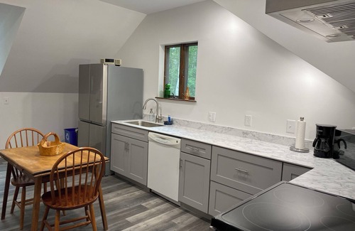 The updated kitchen has new stainless steel appliances and a dishwasher. Kitchen is outfitted with a four person dining table and all the amenities you'll need for your stay including cooking essentials.