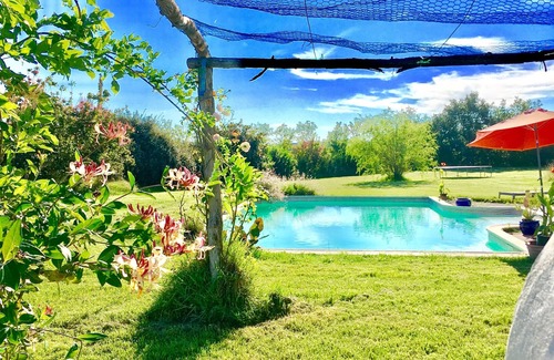 The garden of nearly 5 acres, is not overlooked and has plenty room to do pretty much anything that you want. A mobile gas barbeque, a fixed pizza oven, several tables and lots of chairs make al fresco dining possible anywhere in the garden. For those who want to relax, the 12 * 6 metre pool and large garden is just the place to switch off and recharge the batteries, drink local wines, walk unmolested by traffic, listen to grasshoppers, frogs and Little Owls without getting out of bed. Then, when you have acquired sufficient energy, you can go bicycling, canoeing in the spectacular Aveyron gorge, time travel to the medieval villages Bruniquel and St Antonin-Noble-Val, wonderful market on Sundays. Make a day of this time travelling and take in Puycelci, Albi and Castres too. All this not too far away. Then there is the small city of Montauban, a mere stone's throw to the south west. Montauban is the capital of the Tarn-et-Garonne and has the usual sort of city based stuff. shops, bars, restaurants, people, a cinema, loads of super markets, opticians and hair salons. It also has some unique stuff. The Ingres museum, some really interesting architecture, a large market on Saturday mornings, it's own cathedral and a delightful Place National right in the middle.