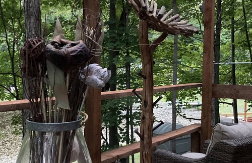 This platform tent is nestled in a quiet corner of our woods, and from the comfy deck chairs, you'll enjoy majestic views of our 30-acre woodland, and down the hill, our quiet koi pond. A separate gravel lane leads to the Selah tent, enabling you to park your vehicle close to your nightly dwelling.