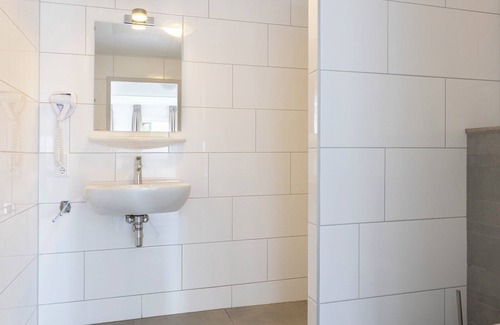 There is a bedroom with a bathroom on the ground floor. This bedroom is wheelchair accessible and has two single box spring beds and a television. The ensuite bathroom has a walk-in shower, washbasin and toilet. The accommodation also has a storage room with a washing machine and dryer. In addition, there is a separate toilet.