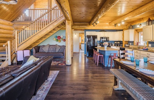 The main floor has a great room with living, dining and kitchen all shared -- a wonderful large space to gather and relax. The living room has a high vaulted ceiling, gas fireplace, and a 55" flat screen with a Blu-ray Player and Netfix, Hulu and HBO Go accounts for you to relax after your adventures. Dining room has an extendable table that can sit up to 10 (12 if you've got kids). Seating for 4 more in the kitchen around the island. Kitchen has beautiful quartz countertops, rustic farmhouse style cupboards, and plenty of space to have a few cooks in the kitchen. Master bedroom has a queen bed and twin bunks, large closet, attached bathroom, and a private deck. Laundry room and 1/2 bath are in the back out of the way.