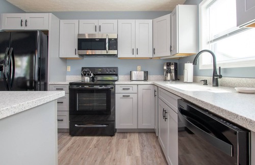 Newly built in 2021, every detail of Seneca Spirit was hand selected and carefully laid out so travelers feel at home while they're away from home. Vinyl-wood flooring spans the length of the open floor plan. The kitchen with soft grey cabinetry offers the perfect amount of counter space for prepping your favorite meals and dining too! The oversized island doubles as dining for six with its expansive granite counter top. Visit the Geneva's farmers market for some local produce an added touch of taste and color to your table spread.