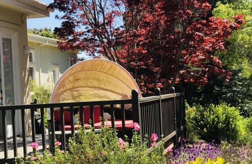 Modern, high end suite in a safe, peaceful, park setting. Bright and airy with all-new decor, 375 sq ft with 10-ft ceilings and hardwood oak floors. Private side access via French doors to a private large patio (350 sq ft) with sofa bed and a 3 piece lounge set with views of redwoods and mountains.
