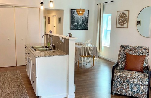 Our lovely space has much to offer. Step into the great room with a large picture window flooding the living area with light. Relax on the soft leather sofa or reclining chair while watching the 50" smart TV with Roku (no live TV). High-speed WiFi is available for remote work or just surfing the net. Enjoy the wood flooring throughout our space.