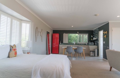 Our large and spacious guesthouse is set amongst an olive grove on 4.5 acres of beautifully landscaped property. Only a 5 minute drive from the center of Havelock, or 15 minutes to Hastings, our location is ideally close and convenient, but feels far away once on property. We invite you to enjoy a nature walk where you might see ducks, native birds, rabbits, our resident hedgehog named Eric, our five sheep, or our two chihuahuas that might come say hi with a big bark! Please close all gates that you find closed to ensure the safety of our sheep.