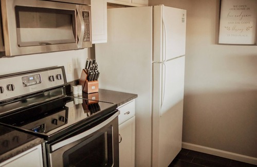 The condo entry is ground level with an easy walk from the parking lot to the front door. There are three separated steps between the parking area and the front door. No stairs exist inside the condo. The unit has 1 bedroom with a king bed and a desk for working if needed, a family room with comfortable furniture including a queen sleeper sofa perfect for kids, 1 bathroom with tub/shower, and a fully stocked kitchen with granite countertops and updated appliances. A Keurig is included as well as varieties of coffee, creamers and sugar/sweeteners for coffee lovers. A full-sized, newer front loading washer and dryer will help to keep up with laundry during your stay if needed. The deck backs to trees and overlooks two golf course lakes providing a gorgeous scenic view from inside the unit. Cable and streaming TV is available with 1 Gig of internet speed. We utilize plant based, non-toxic cleaning products including disinfectant after each stay. A security camera that records voice and motion is placed near the entrance of the condo for added safety.