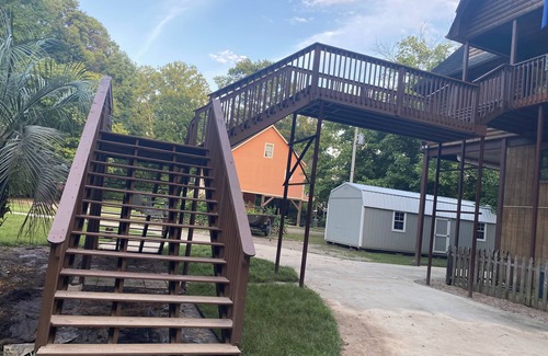 Experience historic Camden like a local in this 3-bedroom house on the Wateree River, just minutes to downtown. Also convenient to I-20, the property is only 30 minutes to downtown Columbia. Wake up to a serene view of eagles soaring and deer frolicking on the undisturbed riverbank. Outdoor entertainment includes swings for any age, a multi-tiered pier, and fishing rod mounts. With 2 queen beds, 1 twin bed, 1 bunk bed (twin over full), 1 crib, and 1 full bed, this enchanting property is perfect for families or groups of friends. Enjoy the full kitchen with modern amenities (fridge/freezer, stove, oven, microwave, toaster, dishwasher and utensils) overlooking the water. The full bathroom has a shower/tub combo suitable for adults and kids alike. With heating and AC, a washing machine, dryer, WiFi, and three TVs, you’ll feel right at home. The easily accessible 30 amp hookup allows guests to park their RVs next to the home. Experience the magic of Camden at our riverfront chalet.