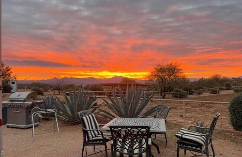 Recognized by Million Mile Magazine as one of the top 10 "Most Unbelievable Places to Celebrate Airbnb's 10th Anniversary" and awarded LUX Magazine's 2020 "Most Serene Desert Accommodation & Horse Boarding Facility- Southwest USA!" Additionally, VRBO selected Rio Rancho Verde (one of 5 vacation rentals out of 3500 in Scottsdale) for a YouTube promotional video, and we've been featured on both a Hulu series special and a Western film production. Rio Rancho Verde offers an amazingly unique Arizona experience, far from the maddening crowds! This exclusive horse ranch/boarding facility is nestled in the heart of the Sonoran Desert, only 20 - 25 minutes from Scottsdale. Our property sits on the border of the Tonto National Forest, and is the perfect authentic Western adventure. Enjoy an upscale ranch experience and discover the inner operations of an exclusive horse boarding facility, just a short distance from Scottsdale. You can experience the "behind the scenes" day to day operations of ranch management and barn maintenance, help us feed the horses carrots from the garden, take a roping lesson from our on-site expert (no cows involved!), sign up for manure management or rent a trusty steed at the stables down the road. Our spacious, luxury travel trailer offers designer décor with a combination of upscale Southwestern and Western furnishings and accessories, with all the amenities. Over 500 square feet of open floor plan, complete with fireplace, separate bedroom and bathroom, huge shower, full kitchen with island, big screen TV, Barcaloungers, queen size bed, huge closet space, additional pull out sofa bed, AC and heat, dining area (seats 6) and your own private spot that faces the Four Peaks Wilderness area. Enjoy cocktails as you watch the sun set and turn the skies crimson, take your morning coffee down to the barn while the horses wait for their breakfast or enjoy the sky full of stars over dinner on your own private patio. We're the perfect destination for hiking, biking and exploring right out of our back gate - we're situated 1/2 mile from the Scottsdale McDowell Sonoran Preserve, which offers 32,000 acres and over 215 miles of trail to explore. Or, just relax and refresh while enjoying a glass of wine as you watch the spectacular sunsets on the ridge overlooking the mountain peaks and desert vistas. We're secluded and surrounded by the most amazing mountain views, saguaro cactus and Sonoran Desert scenery and offer a relaxing alternative to the fast pace of city life. The night skies are filled with stars and you're sure to hear a coyote or two howling in the distance. Take a side trip to the Verde River (9 miles) and keep an eye out for the wild horses that call this area home. There's a stable down the road where you can rent horses, and we can have mountain bikes delivered to the ranch for you. We're committed to an Eco-Ranch lifestyle and are committed to sustainability, being mindful of the ecology in which we live and embracing the environment that surrounds us. We have an organic garden on site and you're welcome to help yourselves to the vegetables we grow. Reduce, reuse, recycle and re-purpose! It's an amazing beautiful site, far enough out that you'll feel like you're in the middle of nowhere but only 25 minutes from Scottsdale and fine dining, galleries, shops and nightlife. Please note that we board horses and the owners are on site with them. We also have 2 other short term rentals, so there are other guests on property. Come join us at Rio Rancho Verde! If the travel trailer package is not available please see our other listings at VRBO 652267 or VRBO 763667. We hope to see you at Rio Rancho Verde!