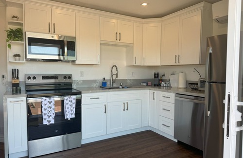 Our guesthouse is a newly remodeled charming unit with a modern charm. The unit has a full kitchen with new appliances, stocked with all the gourmet cookware, plates, and kitchen utensils you need, a living room with plenty of natural light, TV and full size pull-out sofa bed, a master bedroom with a queen size bed, expansive windows to admire the view, and a large bathroom with standup shower, and double sinks. Finally, a large private deck with amazing views, outdoor patio table and chairs, and a BBQ to grill outside.