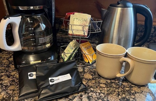The primary bedroom on the main floor boasts beautiful window views and a thermostat-controlled electric fireplace, and there is a small Roku TV in the corner. There are 2 chairs in the room that may be added to the dining space when there are 6 guests. For the queen bed, there is a 12" memory foam mattress and new, quilted bedding for your rest and relaxation. An extra blanket, vacuum, portable high chair (if needed), and box fan can be found in the closet.