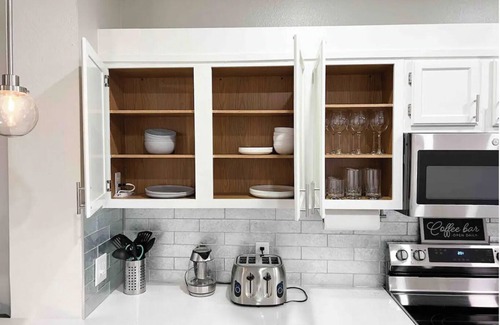 - FULLY stocked kitchen with the necessities & more: oil, salt, pepper, baking sheets, pots, pans, etc.