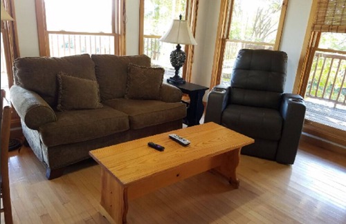 Open floor plan with lots of light streaming in from the many windows in every room in the cabin. Interior of cabin is natural wood and stone floors. Each bedroom is spacious with handmade head boards and private baths. Kitchen is equipped with modern appliances. Den has TV and ample seating. You can cozy up to an outdoor grill/fire pit as well. Large covered porches to enjoy wildlife and morning coffee.
