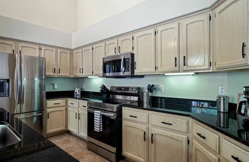 Serenity Hills is a 3 bedroom, 2 bathroom estate. The game room has a cushy sectional couch with a queen size sofa bed, a brand new Air Hockey table and a 65 inch TV. You don't have to miss out on the game while you're having fun! Pass through into the abundantly stocked kitchen. You will find both drip and Keurig coffee makers. The cupboards are filled with all of the essentials - just bring your groceries! The dining room table has seating for six guests. A perfect place to enjoy home-cooked meals or get a fun game going with the family. Cuddle up in front of the natural gas fireplace in the great room to watch a show on the cable TV.