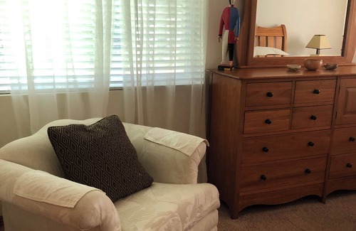 The spacious bedroom has a queen bed, comfy arm chair, luggage bench and cable TV, with windows looking out on wooded privacy. And the living room includes a leather sofa and futon that opens to a queen sized bed for additional comfort.