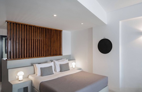 The Serenity Suite offers the perfect setting for couples seeking a romantic escape. Designed in the traditional Cycladic style, this suite boasts a spacious bedroom with a queen-sized bed and a private patio featuring a hot tub, heated during April, May, and October. The highlight of the suite is undoubtedly the outdoor hot tub, providing guests with a mesmerizing view of the sunset and the volcano.