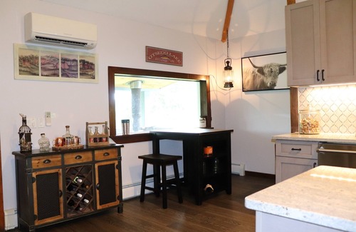 The interior enjoys a welcoming décor. There are cathedral ceilings in the dining area and the kitchen and large windows letting in lots of natural light. The fully equipped kitchen was recently remodeled and includes granite counter tops and a commercial gas range. There is a private sleeping loft off the kitchen with twin beds, perfect for the kiddos. A second bedroom is located just off the kitchen and a full bathroom right across the hall. The third bedroom is next to the living room and the fourth bedroom is in the lower level with a king bed and ensuite full bathroom. The lower level king bedroom also has sliding glass door leading outside! The rooms are spaced out nicely to provide great privacy.