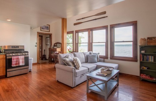 Located at lake level, after coming down two flights of stairs, you enter directly on a large porch with endless views of Cayuga Lake. As you enter, the natural light continues through four large windows that spill into an open floorplan. The first floor has a cozy living room furnished with a sectional couch, gas stove, and Samsung smart TV. The living Room naturally flows into an open kitchen and dining room with a large vaulted ceiling.