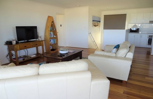 PROPERTY DETAILS: 4 bedrooms - Queen, Queen, Queen, King Single. Sleeps 7; Quilts, electric blankets and pillows provided, BYO sheets, pillowcases, towels and tea-towels; OR optional linen hire $110 available through Country Getaways office; optional linen service fee $50 for beds to be made up. 2 bathrooms, one with bath. Reverse cycle split system air conditioning in living areas (upstairs & downstairs), Ceiling fan in master bedroom & downstairs queen bedrooms. Upstairs & downstairs lounges have television and DVD player, Foxtel channels; fully equipped combined kitchen/dining/lounge upstairs including dishwasher & microwave, small bar fridge in downstairs kitchenette. Stairgate; Front load washing machine, Balcony has distant sea views. Large fully sheltered enclosed rear deck, Hooded gas barbecue, Outdoor seating for 10 people. Grassed rear yard, off street parking with room for a boat, fish cleaning sink. Double car garage, Located a 3 minute walk to the beach, Pets by arrangement only ($100 refundable bond applies per pet) .