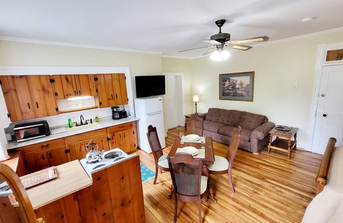 Kick back and relax in this calm, stylish space. The Shepards Suite gives you some neat pieces of the historic Manor House at Gayfield, that was once a large sheep farm! The bathroom boasts a back wall of the exposed original brick from 1848, and the great room features the heart pine flooring and elaborate molding from original construction. The full kitchen is outfitted with a 20" range with oven, microwave, and a 7.3 cu. ft. refrigerator with basic cookware so you can enjoy a evening in!
