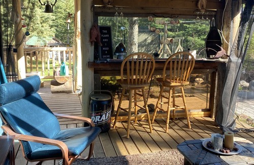 1.5 acres of forest on a parklike setting with partial view of Sheridan Lake, steps to public access. The property boasts stone patio, campfires, gazebo, covered screened porch for outdoor dining and outdoor kitchen with authentic 1930's wood stove, perfect for making pizza and bread. House is elegantly "cabinesque" with heated floors, wood fireplace, pool table and infrared sauna. Breathe the forest air, hear the quiet, watch the deer. Fish, swim, hike, boat, hunt, ATV and winter sports--enjoy the outdoors. Perfect for a wedding, family reunion or vacation.. Meals can be provided. Bunk house and two campsites on site for large families and events. *Please note we are not directly on the lake but steps to a public access. We highly recommend inquiring for particulars before you book.