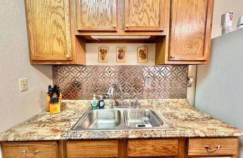 Cook up your favorite meals in the fully equipped kitchen with an electric stove, full-size refrigerator, microwave, and coffee maker. Gather at the dining table for four or enjoy a casual bite at the bar with seating for four more.
