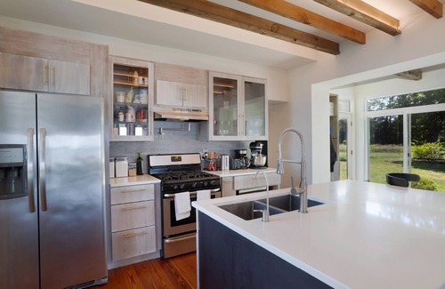 The separate carriage house is 150 feet from the main house providing an appropriate remove and equally charming. Entering a magnificent open arrangement of kitchen, living, and dining areas, this attractive and comfortable cottage has a water presence on a tidal pond that frames nature’s beauty with a wall of windows. The beautiful wood floors, exposed hand hew wood rafters, and craftsman-style kitchen cabinets add warmth.