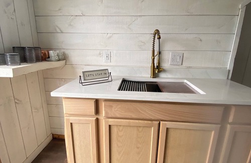 There’s an official bedroom upstairs & a quaint kitchenette. In the living area there’s also a couch made to sleep 2 small children or 1 adult w/ a 55” TV. Downstairs is a high end king size sleep sofa. There’s plenty of room downstairs to open up the ping pong table and enjoy the 65” TV.
