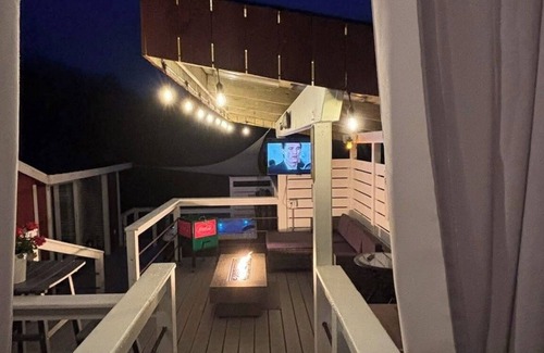 Private hot tub, fire pit, grill, and inviting outdoor lighting