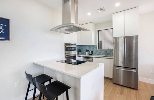 The condo presents a fully equipped kitchen, complete with European-style cabinetry, quartz counters, and contemporary stainless-steel appliances. Guests can indulge in self-prepared meals throughout their stay. The living room combines a cozy lounge and dining area for evening entertainment, offering breathtaking views of the North East Coast, beaches, and the Caribbean Sea.
