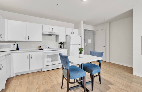 Step into this beautifully furnished 1-bedroom apartment featuring sleek modern design, a plush queen bed, TV, fully equipped kitchen, beautiful couches and in-unit laundry .All bedrooms have bedside lamps. Enjoy natural light, cozy living space, and a peaceful vibe—perfect for extended stays. Centrally located with easy access to shops, dining, and transit!