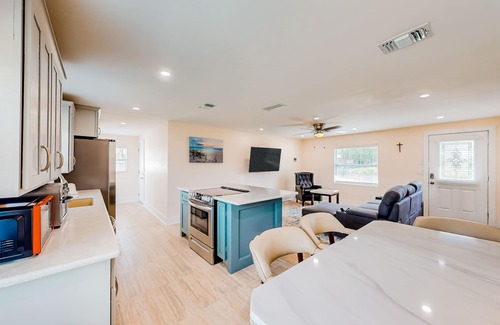 Updated throughout, this spacious, two-bedroom retreat features an open great room with a well-equipped, island kitchen with stainless steel appliances, a dining area with a table for four for mealtimes or rainy day board games, and a living area with comfortable seating and a TV for streaming all your favorite channels.