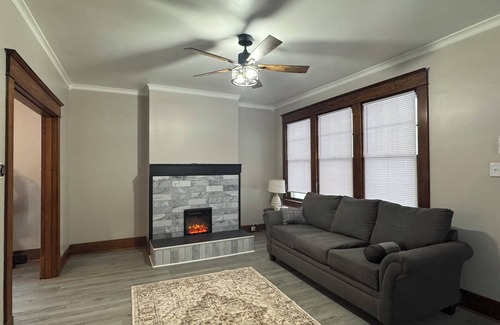 The property has been fully remodeled from head to toe, offering a bright and spacious living room with a decorative fireplace and luxury vinyl planks. The updated kitchen features navel blue cabinets, butcher block counters, and modern appliances like a microwave, dishwasher, and refrigerator.