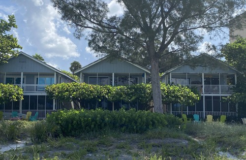 Come enjoy the tranquil setting of this Old-Florida, six unit beach cottage complex situated directly on the Gulf. Built in the early 70’s and remodeled in 2019, this second floor two bedroom/two bath unit also includes a sleeping loft for two, completely renovated kitchen, living room, and porch with unobstructed views of gorgeous sunsets over the white sands and water. Take a winding path just a few steps through sea oats and sand dunes to the Gulf of Mexico. Outdoor grilling, colorful Adirondack chairs, and shade from gorgeous mature Sea Grapes provide a wonderful outdoor gathering area just below the porch. Central air conditioning, washer/ dryer, beds for four, a bunk for three, plus two more in the loft. Generous ground level parking provides a buffer between the road and cottages.