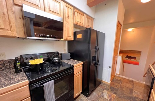 This townhome is in the middle of all that Historic Breckenridge has so much to offer. Just 1 block from Main Street you can enjoy frequent festivals, food, or shopping. A perfect "home away from home" in all 4 seasons, surrounded by our majestic Rocky Mountains. This unit is considered Ski-In and you can Ski-out-to-the-Gondola. Ski-In - Ski-to-Gondola-OutWhen returning to your unit take the Four O’clock ski run down and veer left on the Skyway Skiway. This townhome is a two-floor unit located on the 1st and 2nd floors of the building nestled in the pines. Living Room/Dining Area - The living room has a gas fireplace, large flat-screen TV, and a hip décor that makes this place special. The open floor plan is perfect for enjoying family or friends. The dining area seats 8 with seating the table, the bar and 2 additonal stools.Kitchen - The kitchen is fully equipped with everything you will need to make memorable meals with bar seating for people to talk to the chef.Master Bedroom with ensuite - The master bedroom is located on the lower living level. There is a Queen bed and closet and flat-screen TV. The ensuite bathroom has a sink area and a separate WC with a toilet and tub/shower combo. 2nd Bedroom – the 2nd bedroom has a Full Over Full Twin Bunk Bed. The rooms sleeps 4 people.For additonal sleeping of 2 more people the Living Room sofa has a pullout Air Coil full size mattress that is amazingly comfortable. An electric pump blows it up in less than a minute.2nd Full Bath - The 2nd hall bathroom features a walk-in shower, vanity with storage, and blow dryer.Heated 1-car garage – The unit has a garage for 1 car and a 2nd parking space immediately in front of your garage. You can walk from the garage into the condo. The garage is the perfect place to leave your outdoor toys. There will not be parking for campers, trailers, or oversized vehicles. Twin Elk Lodge Hot Tub – The community hot tub is located close to your building in a secure area for Lodge guests only.The FREE Breckenridge shuttle, which is a five-minute ride to Peak 8, has a stop close to the main driveway on 4 O’clock Road.