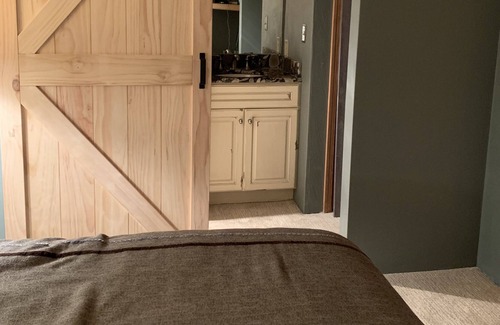 Master bedroom king size bed, chest of drawers and a flatscreen TV. Full bathroom with with barn door, jacuzzi tub/shower combo.