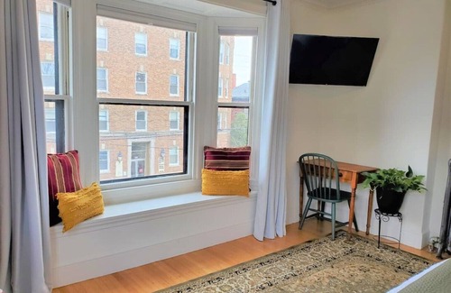 ROOM 1: This north east corner room gets plenty of morning light through its beautiful bay window (although, should you choose to sleep in, with our blackout shades you won't even know the sun has risen!). The attached private bath is extremely small, but what it lacks in space it makes up for in style. This room also comes with one off street parking spot (cannot support larger SUVs/trucks).