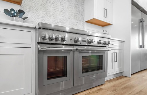 Gourmet chef’s kitchen with quartz counters, custom cabinetry & high-end appliances