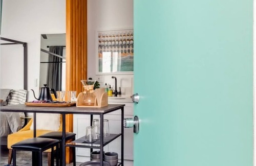 Start your day with a leisurely Chemex pour-over, then step through the inviting turquoise door to unwind in the charming outdoor seating area. Nestled in a picturesque residential neighborhood, this airy retreat combines clean white textured walls with striking metallic and bold black accents for a modern, stylish feel. Available for monthly rent, this home offers comfort, privacy, and a peaceful setting, perfect for long-term living in a serene and inviting environment.