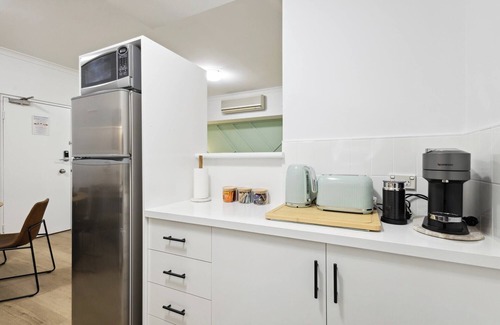 Step into a haven of comfort and style in the heart of Northbridge, WA, where every detail has been carefully curated to offer guests a seamless and inviting experience. As you enter this chic, first-floor apartment, you'll be greeted by an open and airy space, bathed in natural light, that immediately feels like home. The living area, adorned with modern, tasteful furnishings and equipped with AC and a smart TV, offers the perfect blend of functionality and relaxation. This stylish design, with sleek lines and contemporary decor, makes it an ideal spot for unwinding after a day of exploring the city's vibrant streets and attractions.