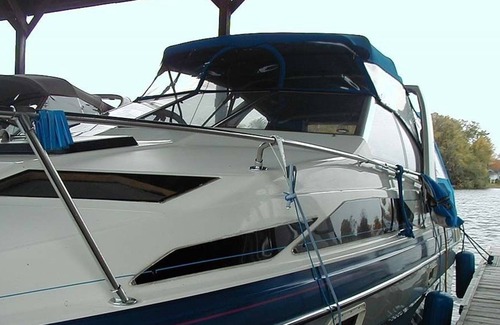 Early Birds is a 28 feet comfortable cruiser for weekend or weekly vacation rental. Run by an efficient economic engine giving her a range of approximately 300km on a full tank of 400 liters. Unlike all other slow boats rented on the Rideau, She can cruise comfortably at 26mph in all lake areas. Cockpit canvas enclosure with mosquito screens and ice coolers allow for all weather entertaining. Sleeps 4 in Queen aft cabin and a forward double vberth at anchor or a rented dock. Cool vent hatches, airy port holes. Easy to handle anchoring, radio, chart plotter navigation and docking assist. Early Birds home is on her trailer in Ottawa. She can be delivered by her trailer anywhere along the Ottawa Montreal Kingston triangle subject to a transport charge. She is rented without fuel, captain, crew or docking fees. For those that can not cruise on their own, a boat operating course is available see website for details. Early birds can be rented from here or its own Ottawa Private Yacht Rental site.