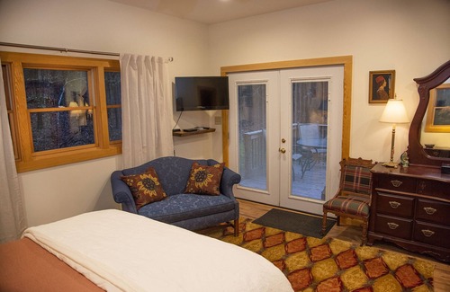 The main level master bedroom suite is a 2017 addition to the original building. It's located at the back of the building and has its own entrance/exit and a hot tub on the deck outside the door (that deck has a wheelchair ramp also). This bedroom is a literal suite unto itself, with a queen bed, full bath, satellite TV, a personal HVAC system, a cabin-custom vanity, an alarm clock with charging station, and a Bose bluetooth sound system. This master features many windows that allow natural light to fill the room when the curtains and blinds on the glass doors are open, with complete privacy when closed.
