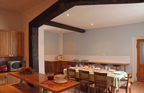 The two-storey farmhouse from 1880 has recently been lovingly renovated in 2013, with much emphasis was placed on combining the traditional elements decorated with modern amenities with solid floors and wooden beams. On a floor space of 160 m² offers friendly living and dining area with integrated, open kitchen, five bedrooms and three bathrooms. On the ground floor the living room has two comfortable sofas, a rustic table, a wide, flat-screen digital TV with satellite channels and USB port, a DVD and a CD player, a stereo, and even a piano, wifi internet is provided.The open fireplace provides a cozy atmosphere and warmth on cooler evenings. Your common meals can be enjoyed on the large table with ten chairs. Through a wide passage, it goes into the modern fitted kitchen with center island and a practical breakfast bar with stools. It has a dishwasher, a 6 burner gas hob with an elegant stainless steel extractor hood, oven, refrigerator/freezer with ice and cold water, a microwave, a kettle and a toaster. Another highlight on the ground floor is still the games room with a pool table. Over a wide tiled staircase it is then up to the upper floor with the bedrooms and bathrooms. Four of the bedrooms are each equipped with a large double bed, in the fifth you will find two large bunk beds before, that will sleep four children or adults. The bathrooms even has a bath with rain shower head, the other two each have a spacious shower (with rain shower head). All three bathrooms have a wash basin with wall mirror and a toilet. A washing machine, two cots and a high chair are available, sufficient linen and towels is provided and the reliable wireless Internet access is offered for free in your vacation home.