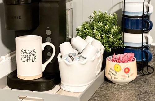 We provide a basic coffee station set up which includes a Kurig coffee machine, coffee pods, sugar and Coffee-mate powdered creamer.