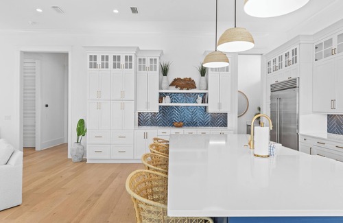 Inside, natural light pours into every room, accentuating a soft coastal palette, wood flooring, and thoughtfully curated furnishings. The main living space flows seamlessly from the fully equipped kitchen—complete with island seating and two dining areas—to the cozy TV lounge, perfect for unwinding after a day in the sun.