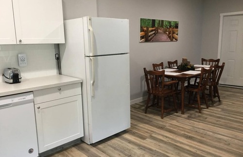 The first is a complete house. There is a full kitchen/ dining room, living room, 1 1/2 baths, and 3 bedrooms, that will sleep 10, on the upper level. The kitchen comes fully stocked with all the amenities to make your stay comfortable and like a home away from home. There is also a small exercise room for those times when you cant get outside.