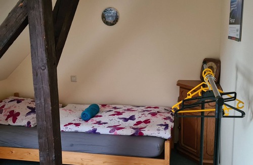 The accommodation (3 bedrooms in total) is on the 1st floor in a 2 family house and an older lady lives on the ground floor. The bathroom and the kitchen are for common use. Leipzig can be reached in about 1 hour by public transport, half an hour by car, the airport is 10-15 minutes by car, by bus in about 25 minutes. Please shoes in the hallway area of the 1st Put the FLOOR down, slippers are on the ground floor, please wash used dishes and put them back in the cupboard, utensils are there, thanks