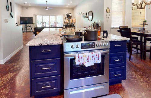 This is a large one bedroom one bathroom house with two single fold out beds. The house as a very functional kitchen and work space. The front yard has a fire pit and the back yard has a beautiful pond.