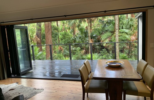 The 2 bedroom western red cedar cottage is nestled within a tropical rainforest reserve, with cabbage tree & pacific palms, towering gum trees which are home to cat birds, brush turkeys, black cockatoos, kookaburras, whip birds, bats, possums.....and lots more.The rain-forest at the rear of the house is home to a large bat colony in the warmer months. The bats fly off at dusk to feed elsewhere & most of our guests find this an amazing experience to be able to witness nature so close from the comfort of their own private tree house.